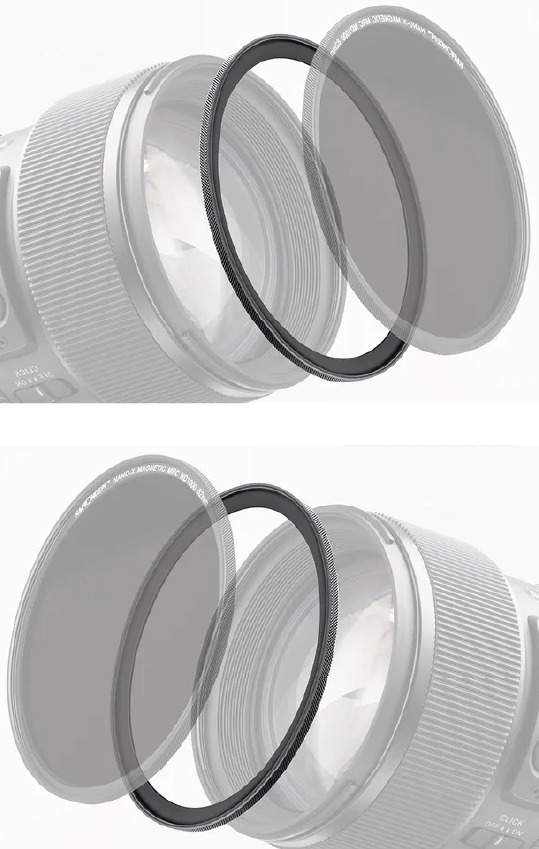 El diseño del anillo permite que quede perfectamente integrado en la rosca del lente. Esto no solo aporta una estética más discreta y profesional, sino que también ayuda a minimizar el riesgo de viñeteo al utilizar filtros de mayor tamaño, incluso en lentes gran angulares.