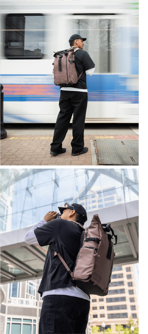 La PRVKE 31L está diseñada para adaptarse a tus necesidades. Su sistema rolltop permite aumentar la capacidad de 31 a 36 litros en cuestión de segundos, ideal cuando tu día de viaje o sesión fotográfica requiere más espacio. Puedes llevar desde equipo fotográfico hasta ropa, accesorios o artículos personales sin sacrificar comodidad ni estética. Su diseño limpio mantiene un perfil estilizado incluso cuando está completamente expandida.