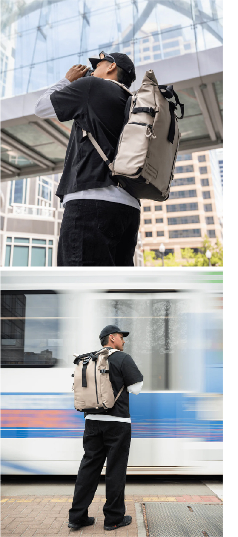 La PRVKE 31L está diseñada para adaptarse a tus necesidades. Su sistema rolltop permite aumentar la capacidad de 31 a 36 litros en cuestión de segundos, ideal cuando tu día de viaje o sesión fotográfica requiere más espacio. Puedes llevar desde equipo fotográfico hasta ropa, accesorios o artículos personales sin sacrificar comodidad ni estética. Su diseño limpio mantiene un perfil estilizado incluso cuando está completamente expandida.