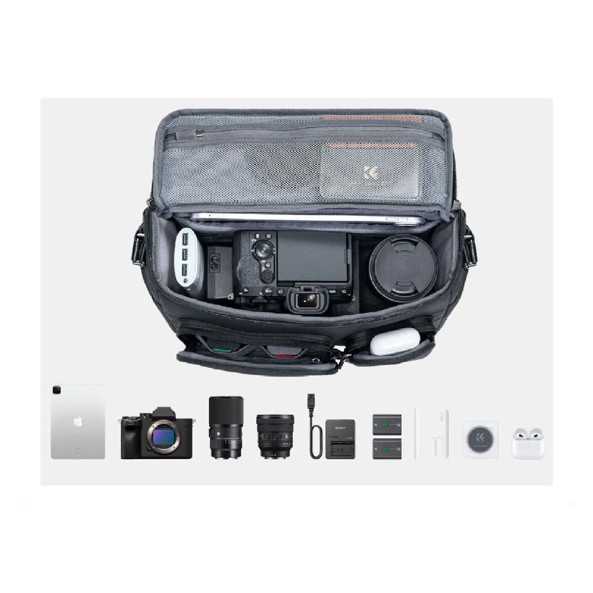 El compartimento principal cuenta con separadores ajustables que te permiten configurar el espacio según el tamaño de tu cámara y lentes. Es ideal para una cámara mirrorless o DSLR compacta, uno o dos lentes adicionales, baterías, tarjetas de memoria y cargadores. También incluye un bolsillo dedicado para tablets de hasta 10.3 pulgadas, perfecto para revisar fotos o gestionar tu trabajo en movimiento. Los bolsillos frontales, laterales y traseros agregan espacio extra para objetos personales o accesorios pequeños.