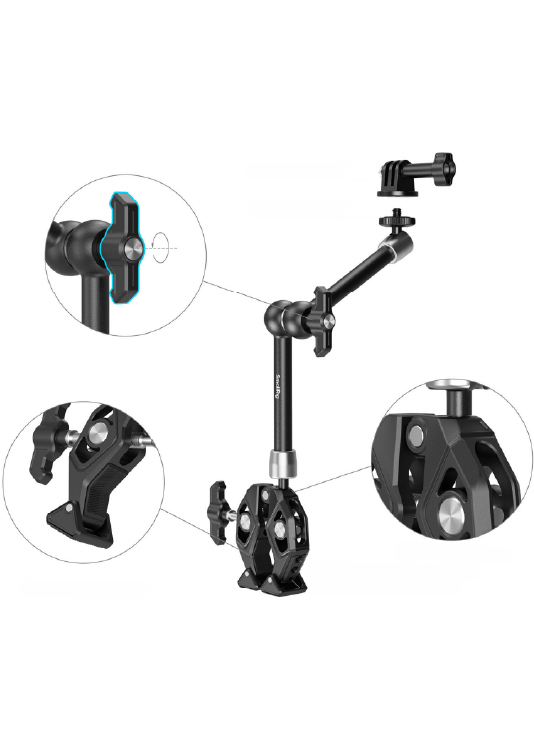 El brazo mágico con pinza y montura para cámara de acción es una solución de montaje compacta y robusta diseñada para fotógrafos, videógrafos y creadores de contenido. Este kit combina una abrazadera estilo “cangrejo”, un brazo mágico articulado y un adaptador para cámara de acción, permitiéndote sujetar tu equipo fácilmente a superficies como mesas, tubos, patas de trípode o anillos de estabilizador y posicionarlo en prácticamente cualquier ángulo con total seguridad.