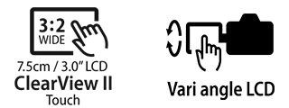 Cuenta con una pantalla táctil LCD Clear View II de 3.0 pulgadas, ángulo variable y 1.04 megapíxeles.