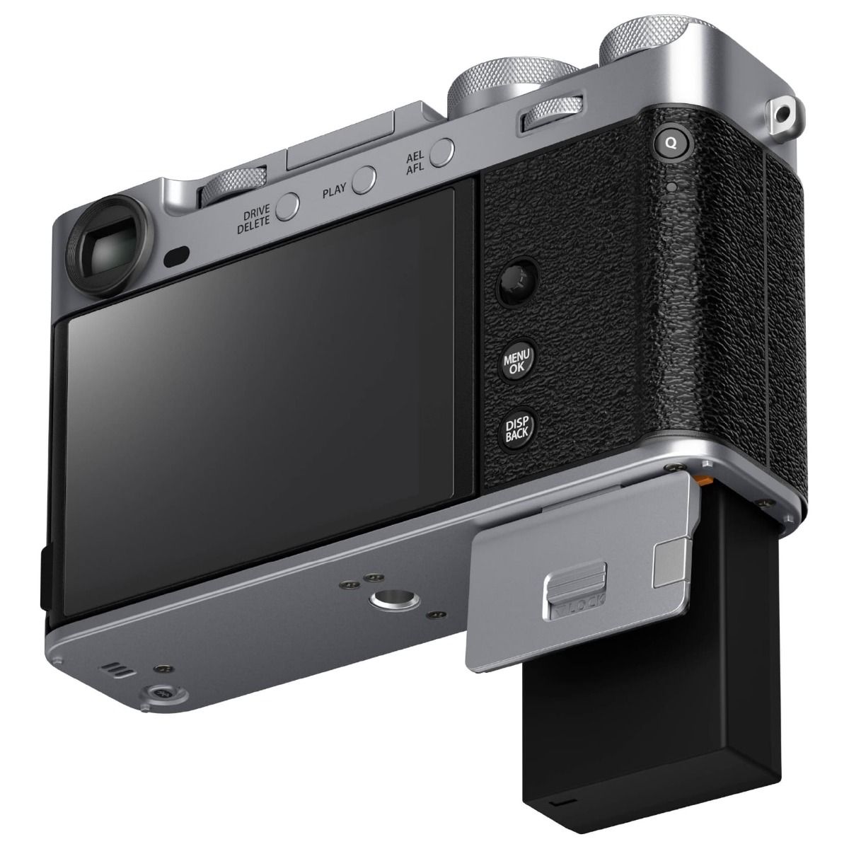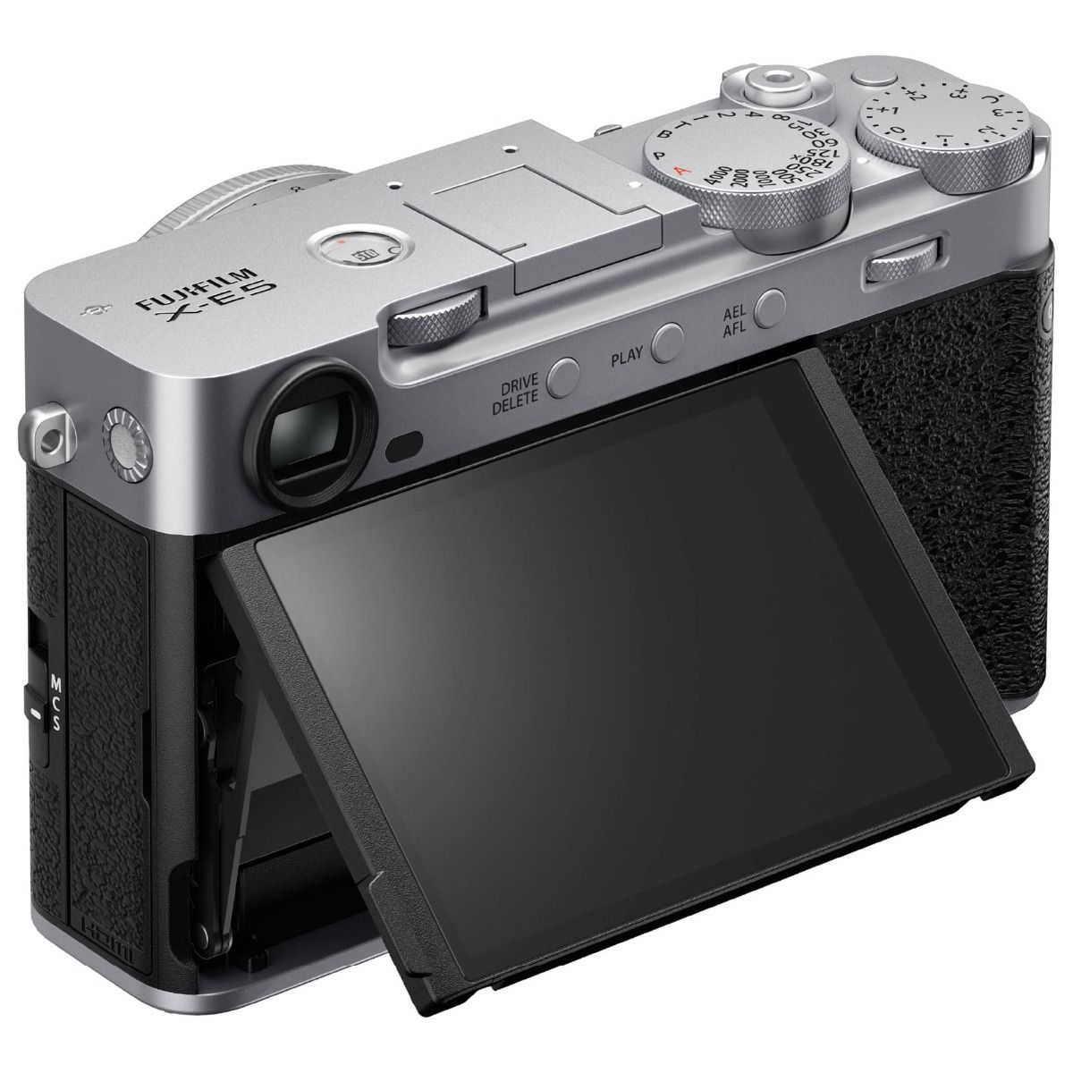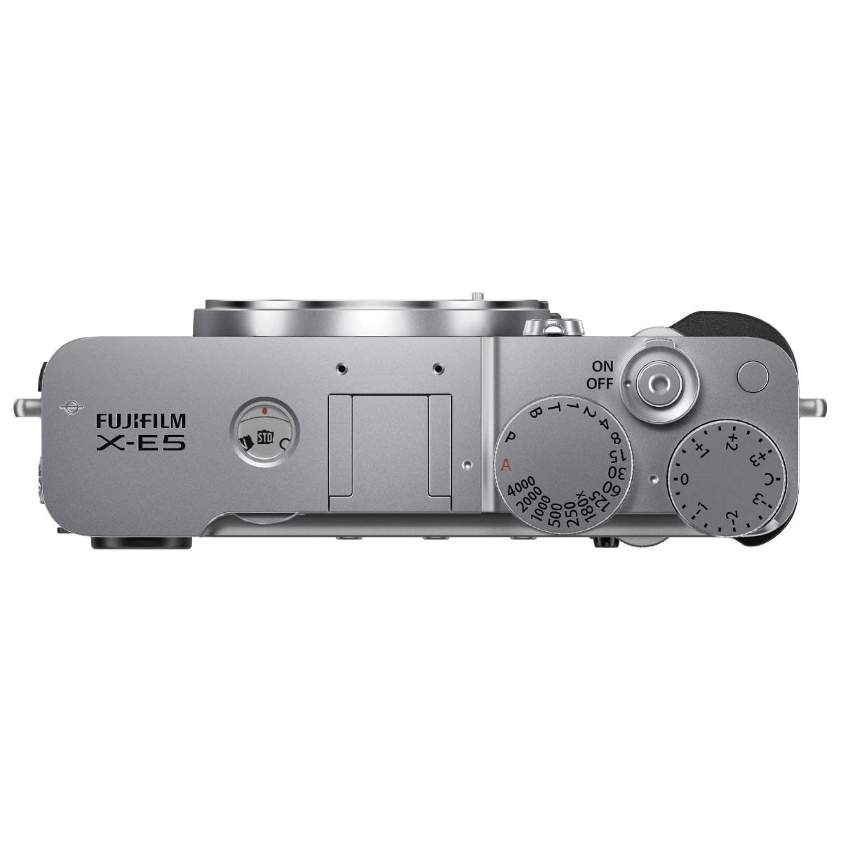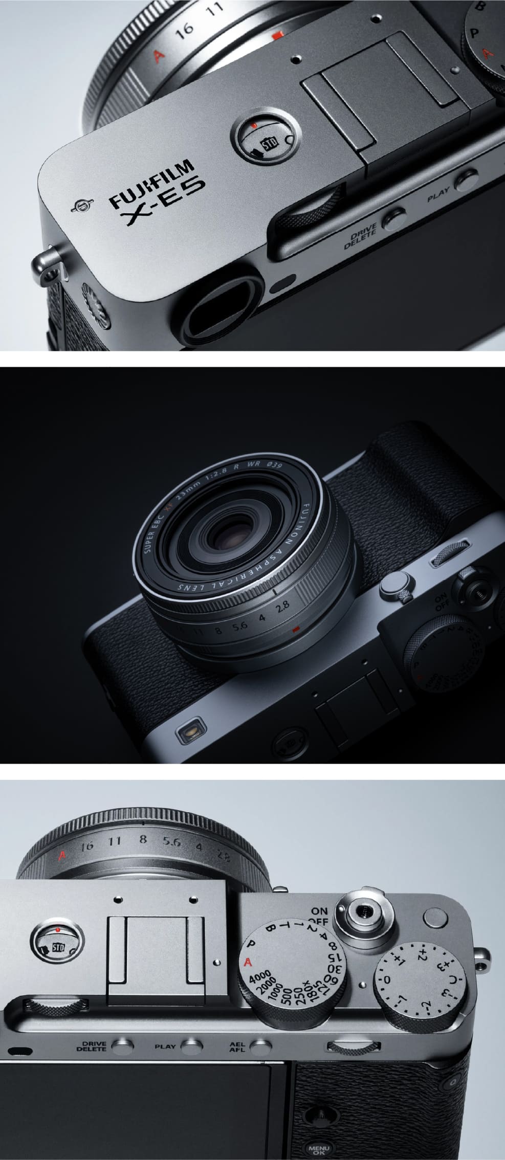 Con su cuerpo metálico y acabados premium, la X-E5 conserva la estética clásica que caracteriza a Fujifilm, inspirada en las cámaras telemétricas. Su construcción en aluminio mecanizado ofrece una sensación sólida y ligera, con un peso aproximado de 445 gramos. Los controles físicos están pensados para una experiencia táctil cómoda y precisa, manteniendo la filosofía de fotografía tradicional de la marca.