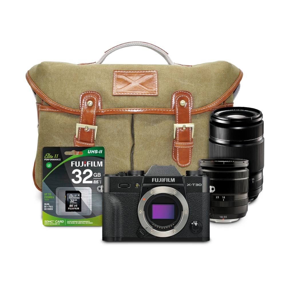 Cámara Fujifilm X-T30 , batería de iones de litio NP-W126S, Lente Fujinon XF18- 55mm F2.8-4 R LM OIS, Lente Fujinon XF55-200MM F3.5-4.8R, adaptador de alimentación de CA, correa para el hombro, tapa del cuerpo, clip de la correa, cubierta protectora, cable USB, herramienta de sujeción del clip, manual del usuario, tarjeta SD 32GB UHS-II y maleta.