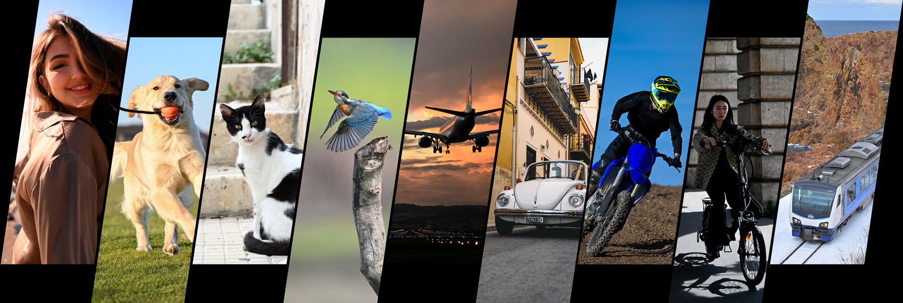 Personas, perros, gatos, aves, aviones, automóviles, motocicletas, bicicletas y trenes.