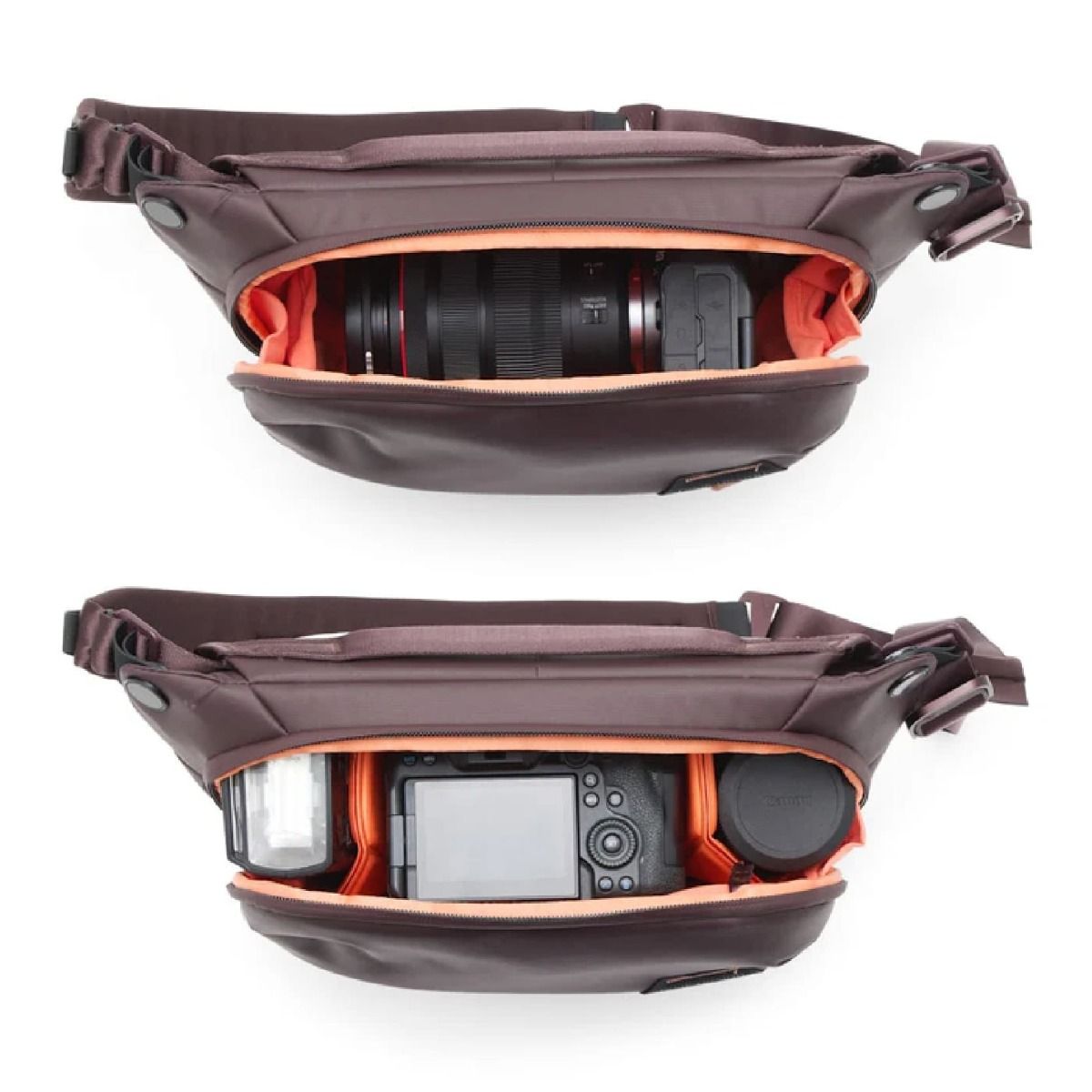 La correa principal es ajustable con una sola mano y se puede configurar para utilizarse en el hombro derecho o izquierdo. La sling se puede llevar cruzada, al pecho, a la espalda o incluso como riñonera. También integra correas externas que permiten sujetar un trípode, una prenda ligera o accesorios adicionales.