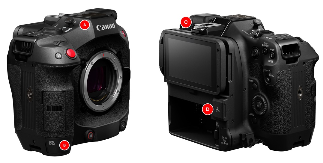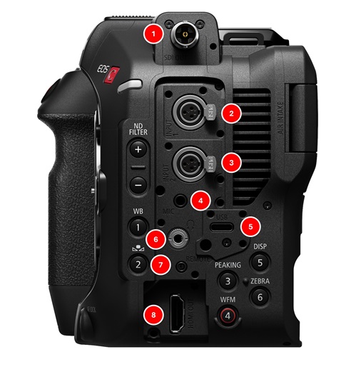 La Canon Cinema EOS C80 cuenta con un conjunto diverso de interfaces que la convierten en una cámara versátil para diversas producciones. La EOS C80 se distingue por su SDI 12G o 3G integrado y una segunda salida BNC de tamaño completo para código de tiempo, que permite la transferencia de señales de video sin comprimir con una conexión de cable segura.