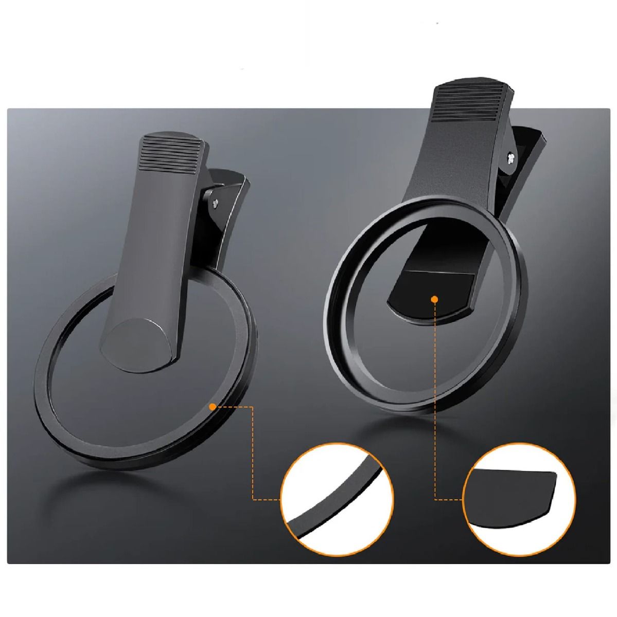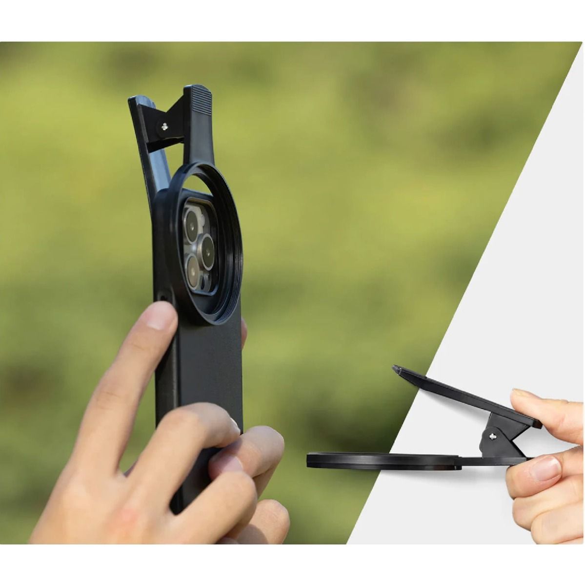 Gracias a su diseño de clip trasero, este soporte se instala en tu teléfono en cuestión de segundos, sin necesidad de tornillos ni ajustes complicados. Es el accesorio ideal para creadores de contenido que buscan practicidad, ya sea grabando en movimiento o haciendo fotografía urbana.
