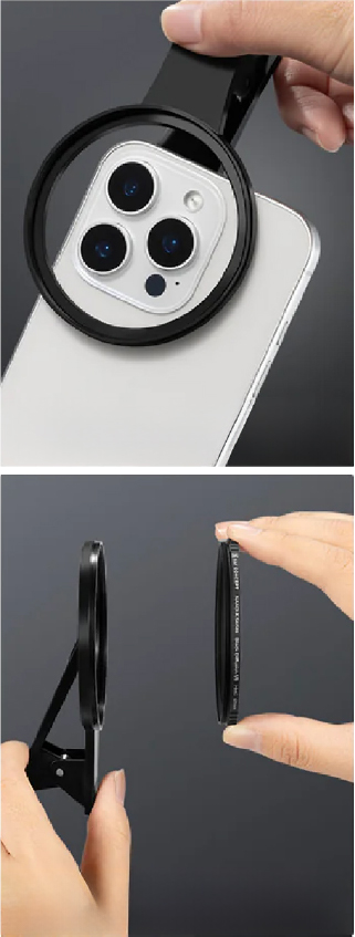 Transforma tu smartphone en una poderosa herramienta creativa con el clip universal metálico para filtros de 67 mm. Diseñado para facilitar la instalación de filtros fotográficos estándar en cualquier teléfono móvil, este accesorio combina portabilidad, resistencia y compatibilidad para que puedas capturar imágenes y vídeos con calidad profesional, estés donde estés.