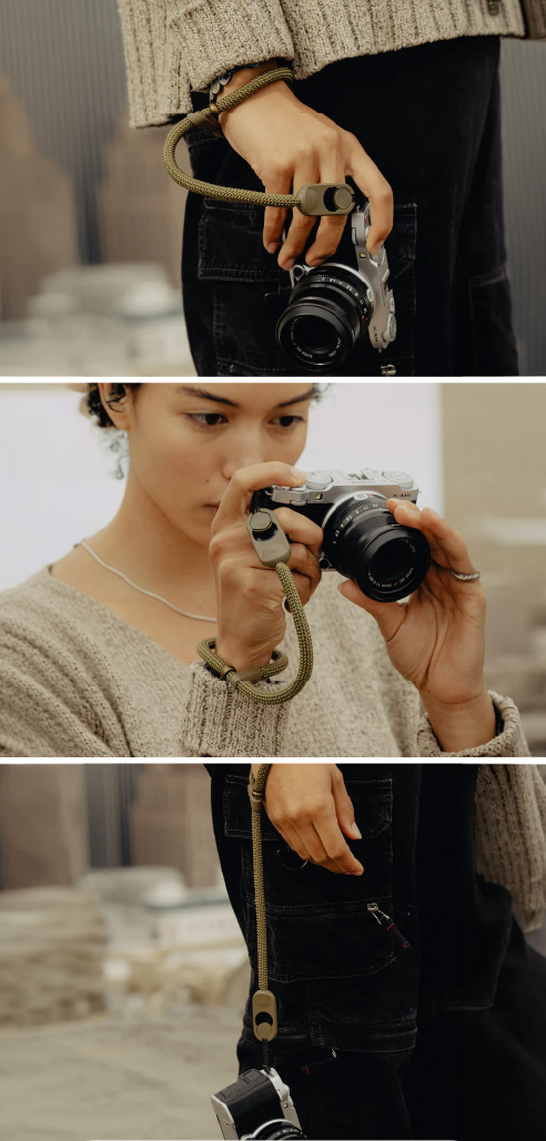 La Cuff incorpora un sistema que se ajusta automáticamente alrededor de tu muñeca cuando detecta tensión, actuando como un mecanismo de seguridad inteligente. Si la cámara se desliza accidentalmente de tu mano, la correa se contrae para evitar caídas. Este sistema brinda protección activa en situaciones dinámicas, como fotografía en movimiento o disparos rápidos.