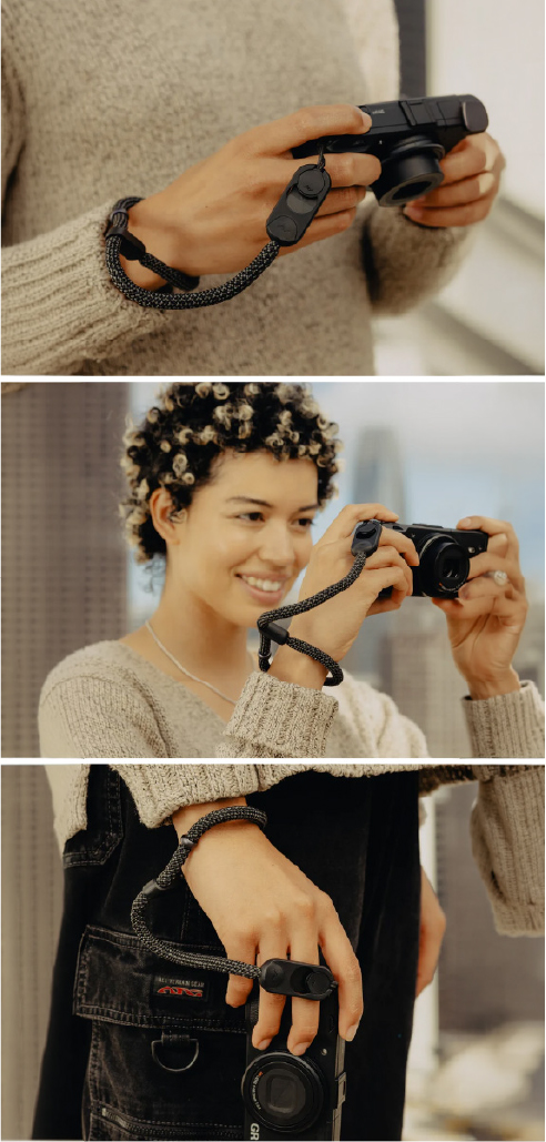 La Cuff incorpora un sistema que se ajusta automáticamente alrededor de tu muñeca cuando detecta tensión, actuando como un mecanismo de seguridad inteligente. Si la cámara se desliza accidentalmente de tu mano, la correa se contrae para evitar caídas. Este sistema brinda protección activa en situaciones dinámicas, como fotografía en movimiento o disparos rápidos.