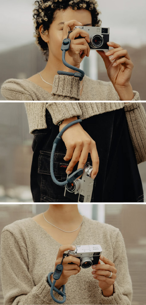 La Cuff incorpora un sistema que se ajusta automáticamente alrededor de tu muñeca cuando detecta tensión, actuando como un mecanismo de seguridad inteligente. Si la cámara se desliza accidentalmente de tu mano, la correa se contrae para evitar caídas. Este sistema brinda protección activa en situaciones dinámicas, como fotografía en movimiento o disparos rápidos.