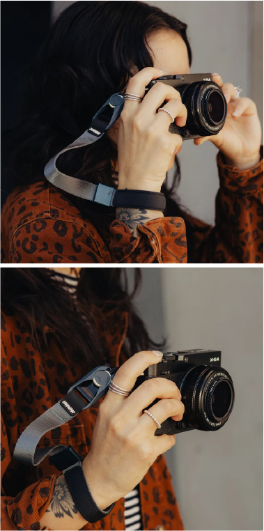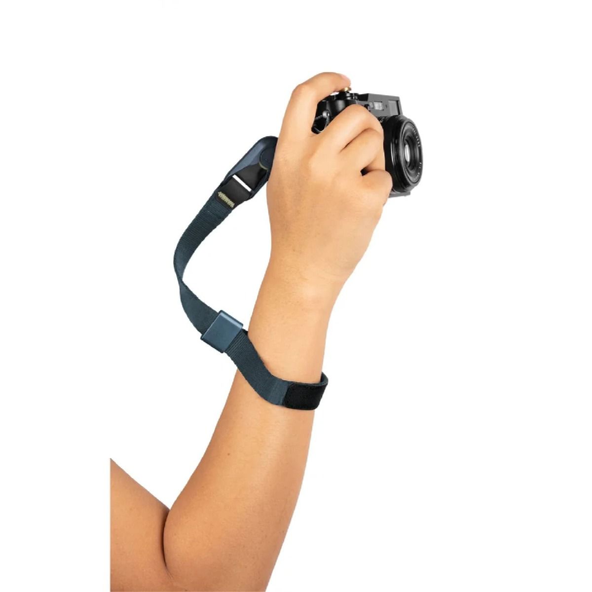 La correa incorpora una hebilla de aluminio anodizado y una cinta de nailon ultrarresistente que se ajusta fácilmente a la muñeca. Puedes dejarla suelta para insertar la mano sin dificultad o apretarla para asegurar la cámara durante su uso.