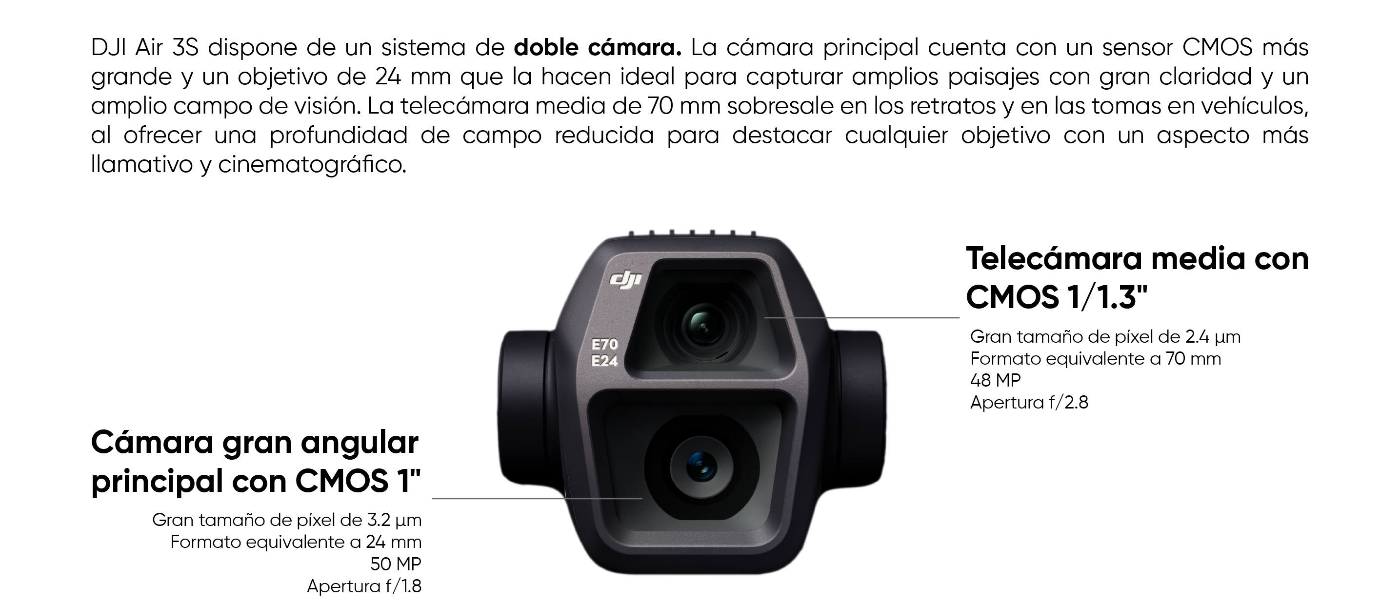 Un dron con doble cámara diseñado para la fotografía de viajes, integra una serie de tecnologías avanzadas. Con una cámara principal con sensor CMOS de 1 pulgada y una telecámara media de 70 mm, captura paisajes, retratos y mucho más con detalles increíbles.