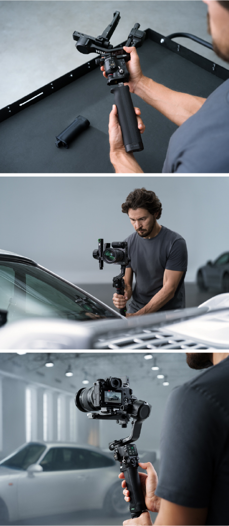 Pensado para el uso profesional, el RS 5 presenta un diseño refinado y ergonómico que mejora la comodidad durante largas sesiones. Su empuñadura tipo maletín facilita las tomas en ángulos bajos y movimientos complejos, mientras que los controles físicos, joystick y pantalla táctil permiten acceder rápidamente a los ajustes sin distraerse de la escena. Todo está diseñado para un manejo ágil y preciso en cualquier situación.