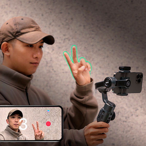 ¿No quieres usar temporizador? Con la función de control gestual del Smooth 5 solamente tienes que hacer la V con los dedos y el gimbal te empezará a grabar de forma automática.
