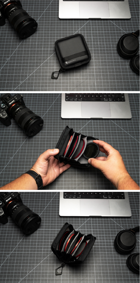 Este estuche te ofrece cuatro ranuras independientes para filtros de hasta 82 mm, manteniéndolos siempre organizados y separados. No tendrás que preocuparte por choques o rayaduras entre ellos, y lo mejor: cada filtro tiene su lugar, lo que agiliza los cambios en plena sesión y te permite trabajar de forma más eficiente.