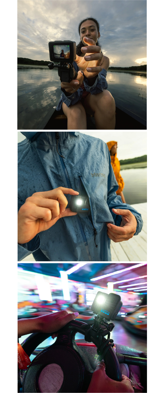 La LIT HERO integra una luz frontal potente, perfecta para grabar en ambientes con poca iluminación sin necesidad de accesorios externos. Esto significa que tus aventuras nocturnas, tomas interiores o escenas con luz limitada siempre tendrán claridad y detalle. La luz también funciona como guía visual para encuadrar mejor tus escenas y destacar objetos o personas en el encuadre, asegurando resultados profesionales incluso en condiciones desafiantes.