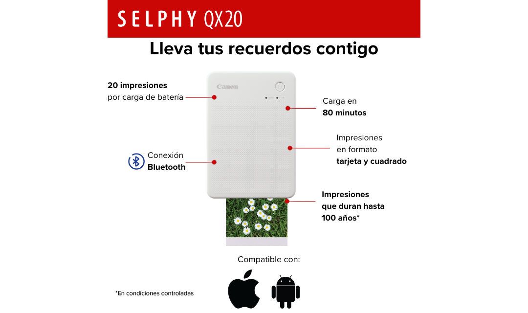 Su tecnología de impresión térmica por sublimación ofrece colores vivos y acabados resistentes al paso del tiempo, mientras que su diseño compacto y elegante en color blanco facilita transportarla y usarla en cualquier lugar. La SELPHY QX20 es perfecta para capturar momentos especiales y llevarlos al formato físico con calidad Canon.