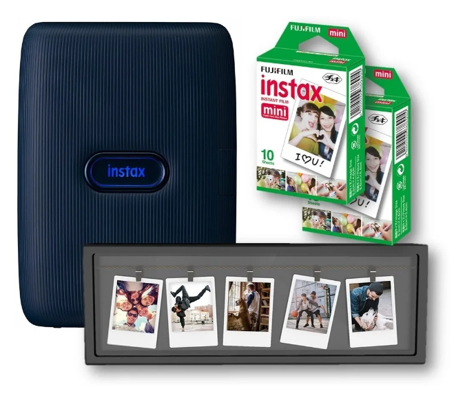 Impresora Fujifilm Instax Link Azul, Correa muñequera, Cable USB para carga, manual de usuario, 20 hojas de película y un marco para que coloques tus fotos favoritas.