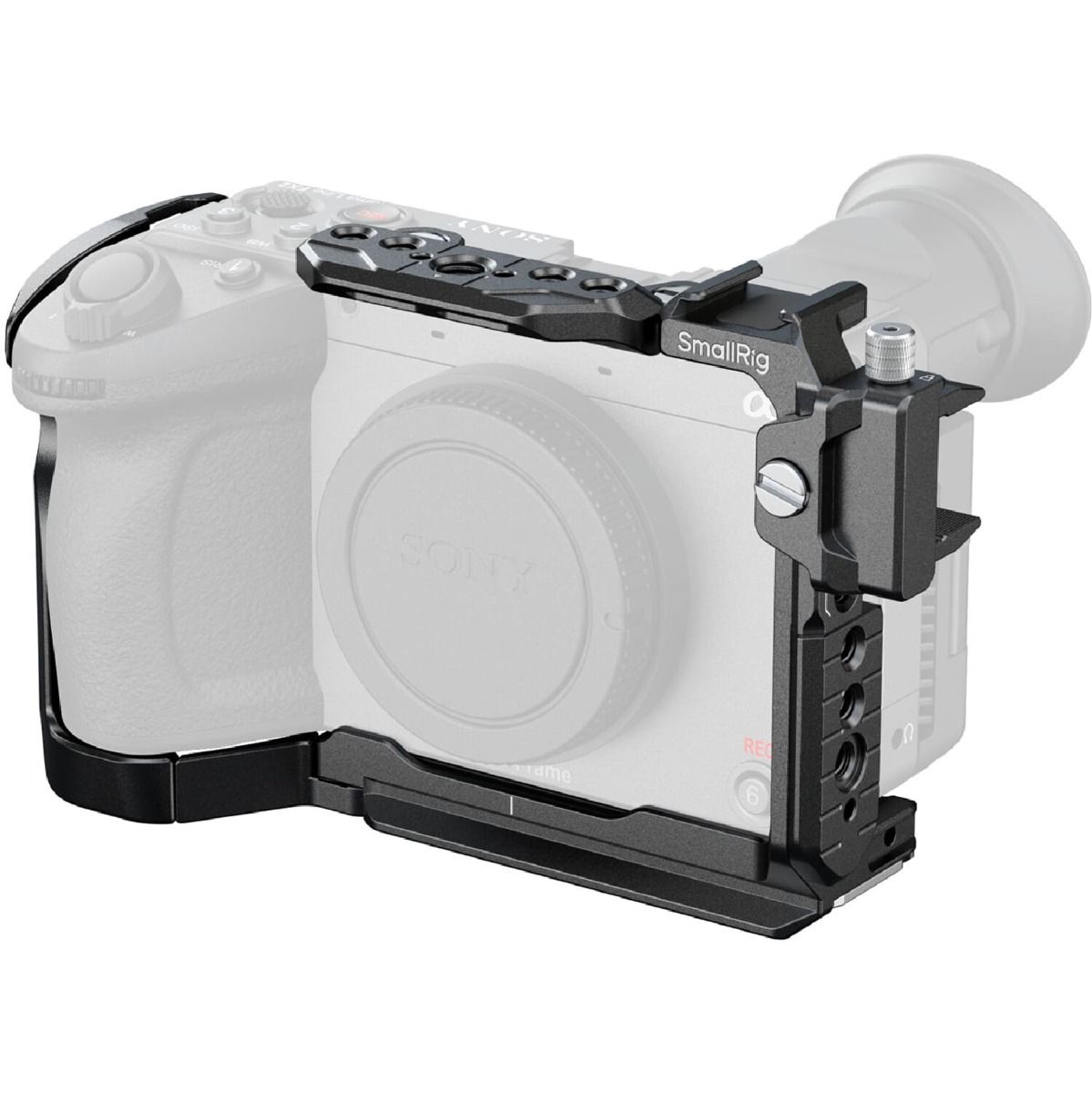 El cage envuelve completamente el cuerpo de la Sony FX2, proporcionando una protección sólida contra golpes y uso intensivo. Su diseño a medida asegura un ajuste firme sin holguras, manteniendo la cámara estable durante grabaciones prolongadas o configuraciones con múltiples accesorios.