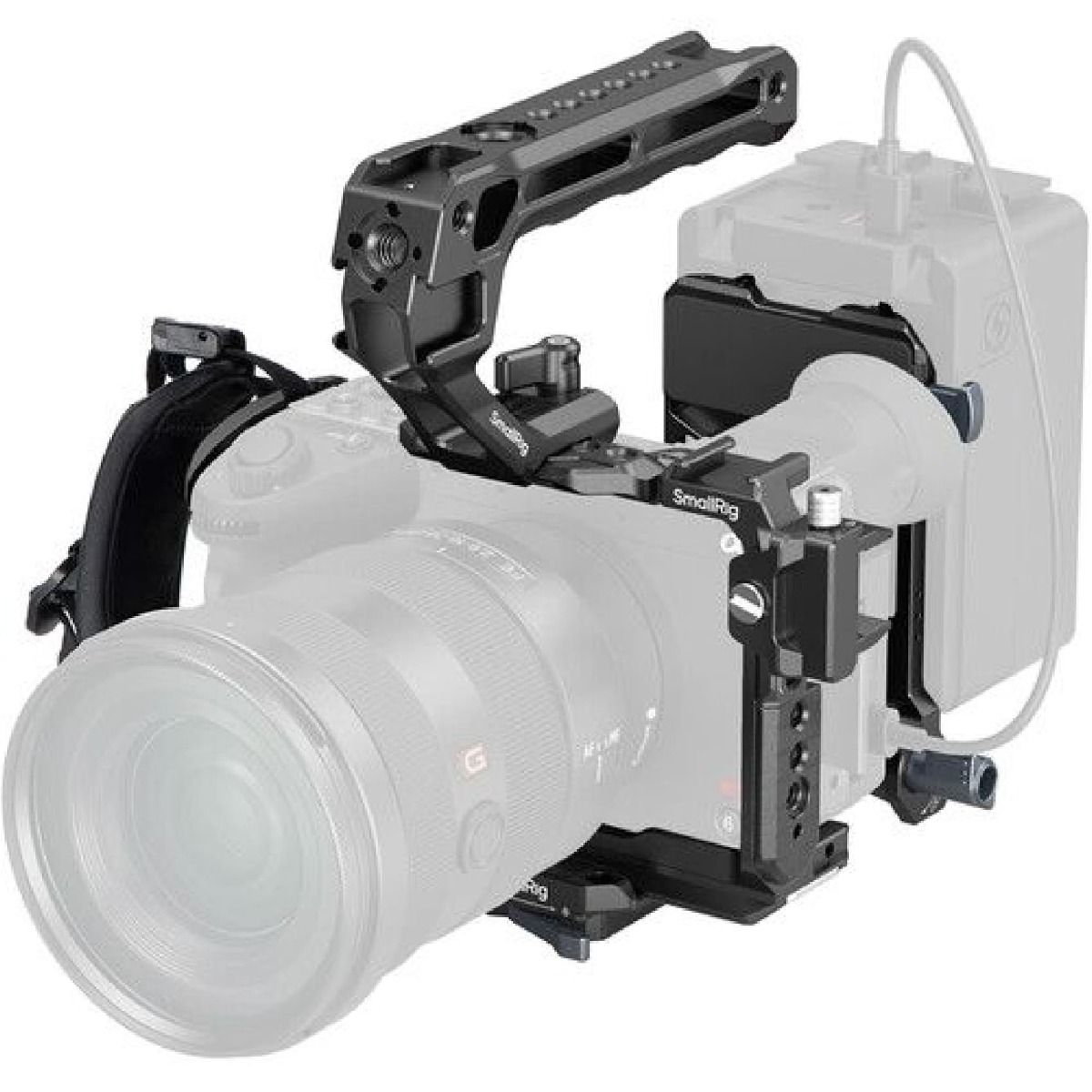 El cage está diseñado específicamente para la Sony FX2, envolviendo el cuerpo de la cámara con una estructura sólida que la protege contra golpes, vibraciones y desgaste por uso continuo. Su ajuste preciso evita movimientos indeseados y mantiene la cámara firmemente asegurada incluso en configuraciones con múltiples accesorios.