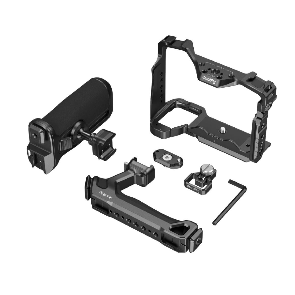 El kit incluye empuñadura superior y empuñadura lateral ajustable, proporcionando mayor control y comodidad en grabaciones a pulso. La empuñadura lateral permite ajustes de ángulo para adaptarse a diferentes estilos de filmación, mejorando la estabilidad en tomas en movimiento o ángulos bajos.
