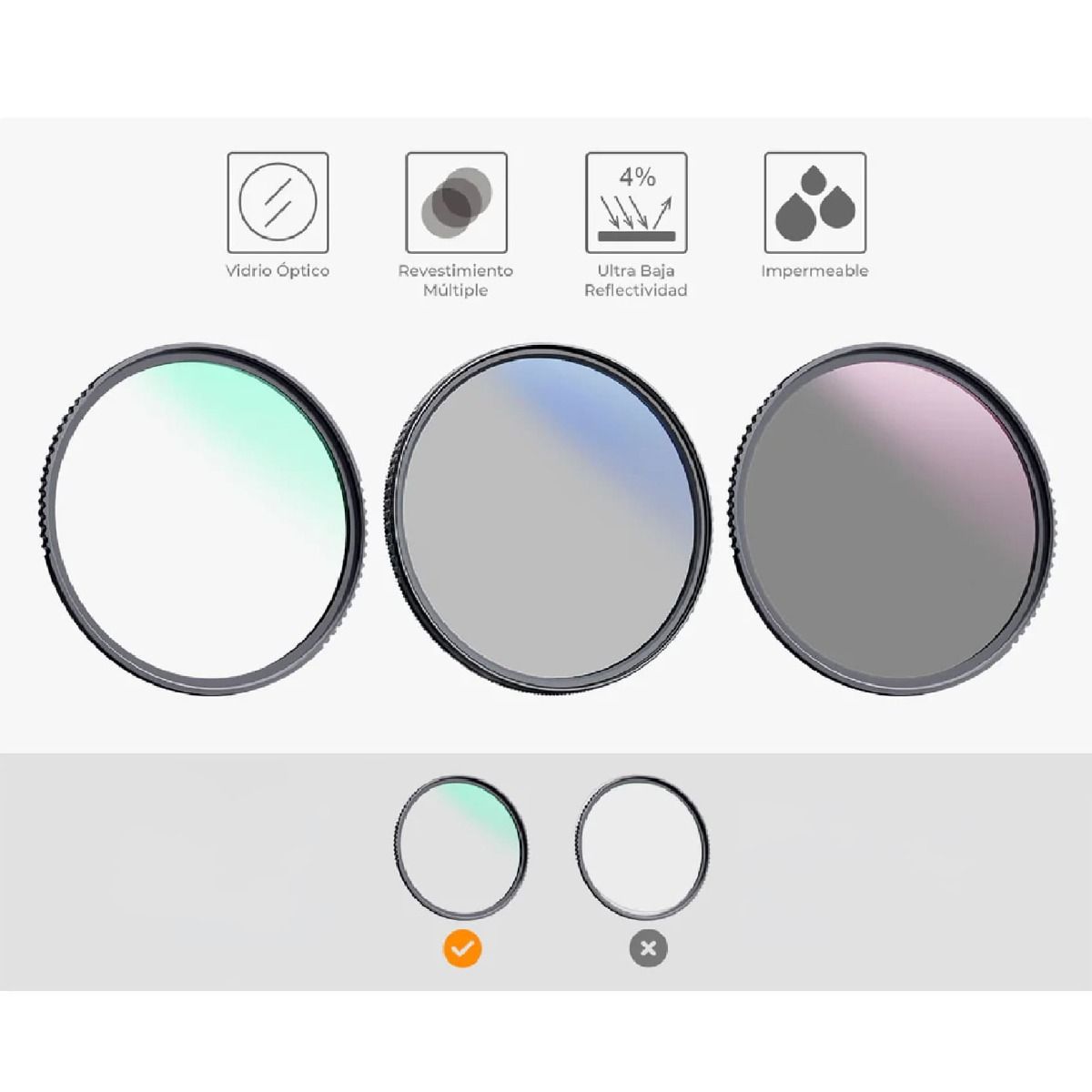 Además de su función óptica, este kit brinda una capa adicional de protección para la lente, evitando daños por golpes leves, polvo o humedad. Incluye una funda de transporte compacta y un paño de microfibra para mantener los filtros limpios y siempre listos para usar. Es un conjunto pensado para acompañarte en cada proyecto, ofreciendo comodidad, seguridad y rendimiento profesional.