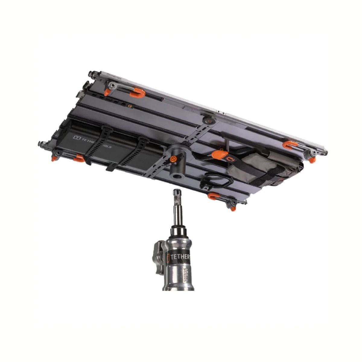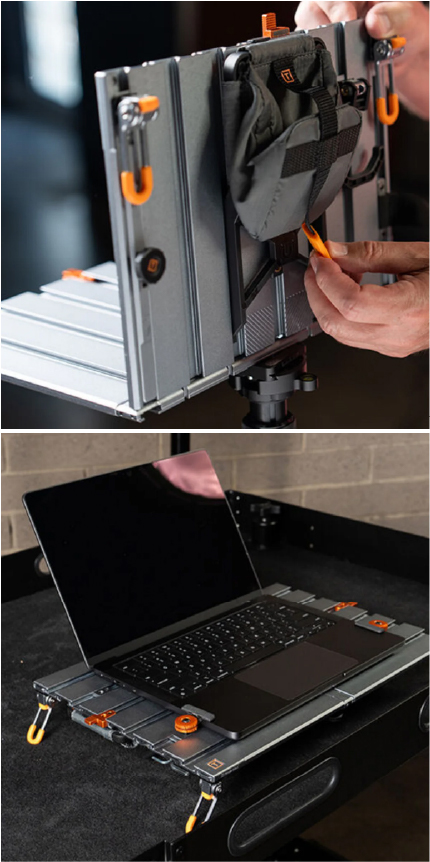 El sistema de rieles AeroTrac integrado permite montar y reorganizar accesorios tanto en la parte superior como inferior de la plataforma. Esto facilita crear configuraciones personalizadas según cada proyecto, manteniendo todos los elementos organizados y seguros durante el uso o transporte.