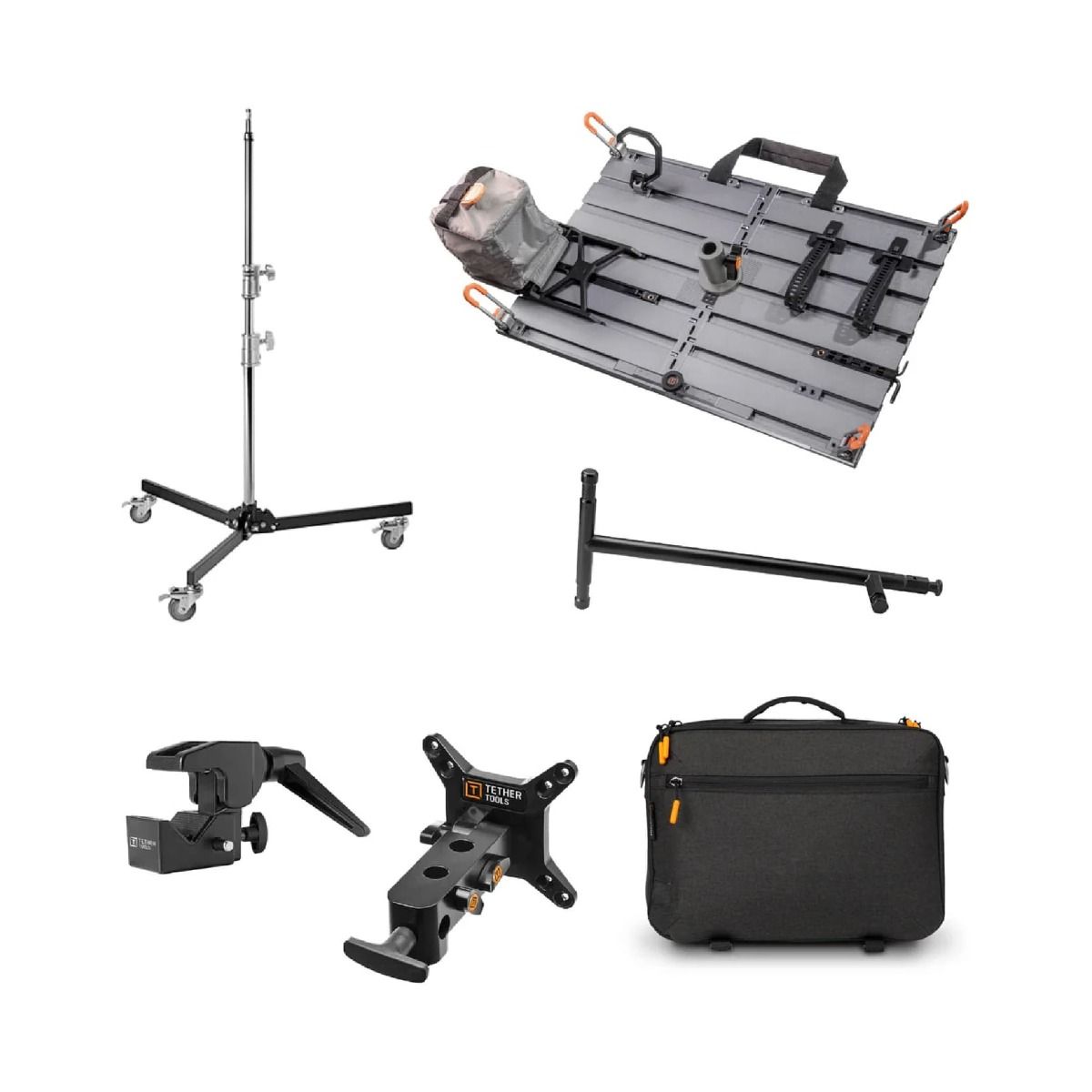 Incluye múltiples accesorios como abrazaderas, correas, ganchos y soporte para monitor que ayudan a mantener cables, dispositivos y herramientas perfectamente organizados. Esto reduce el desorden en el set y mejora significativamente la eficiencia durante sesiones de tethering.