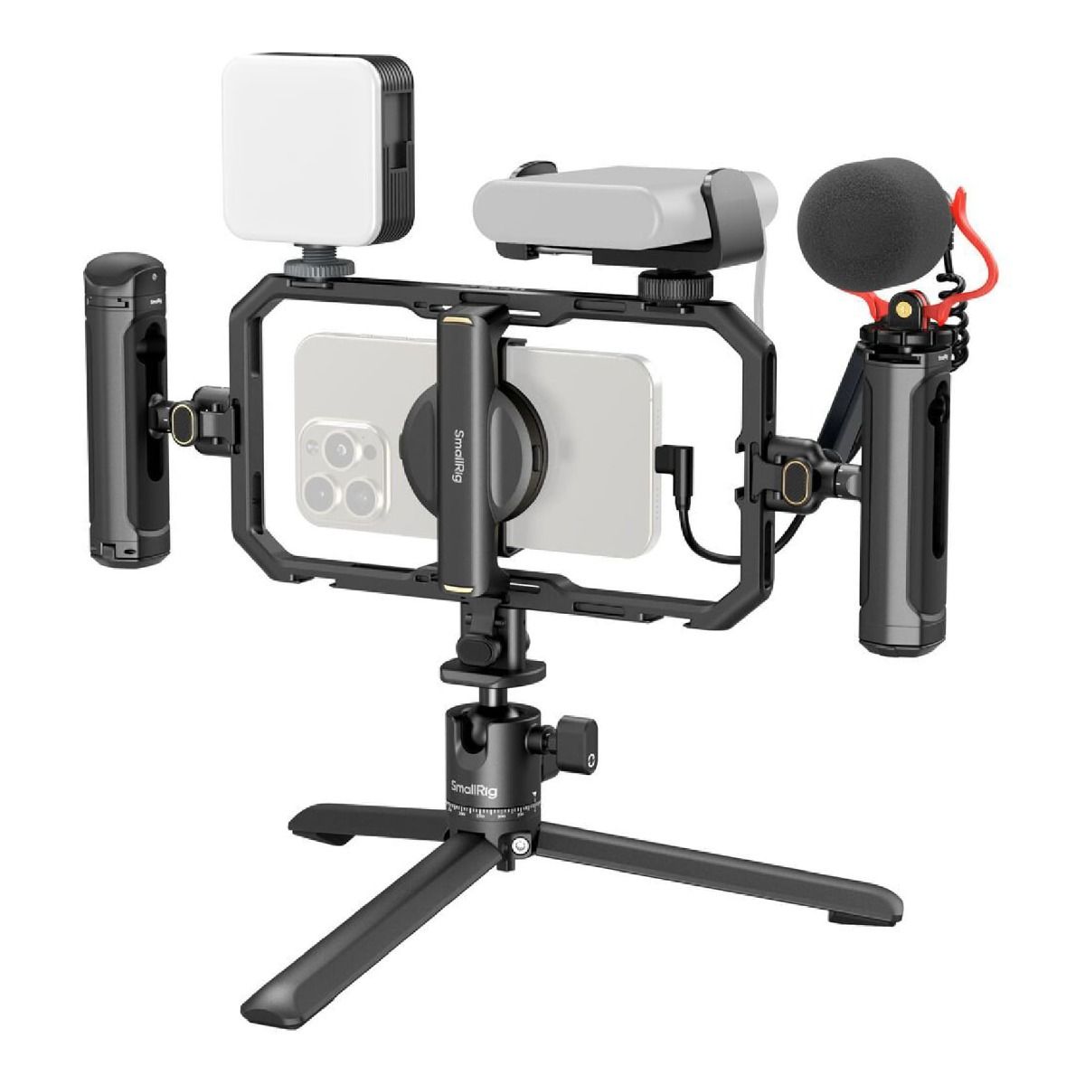 El kit incluye todos los accesorios esenciales: trípode de mesa, abrazadera para banco de energía, adaptadores USB-C y Lightning, así como bridas de velcro. Su diseño compacto y modular te permite grabar en mano, sobre trípode o en movimiento, ofreciendo la máxima versatilidad en cualquier escenario.