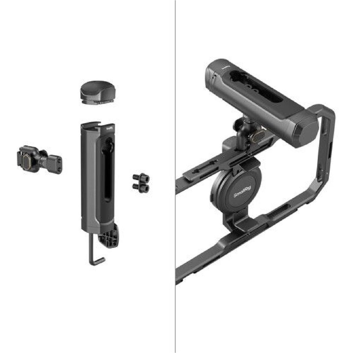 El asa lateral ergonómica incluye un sistema de liberación rápida que permite cambiar su posición de manera instantánea. Puedes usarla como empuñadura lateral o superior, ofreciendo comodidad y estabilidad durante las tomas en movimiento. Su rotación infinita facilita capturar ángulos creativos sin perder control sobre la cámara.