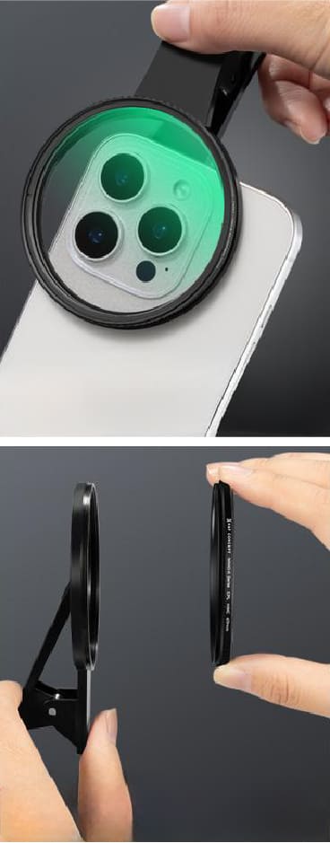 El práctico clip con sistema magnético permite montar el filtro en cuestión de segundos, sin necesidad de herramientas ni adaptadores adicionales. Su estructura robusta asegura un ajuste firme sin dañar la lente del teléfono, y es compatible con la mayoría de modelos de smartphones, incluso con funda. Solo necesitas colocar el clip, ajustar el filtro… ¡y listo para disparar!