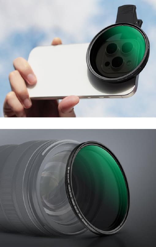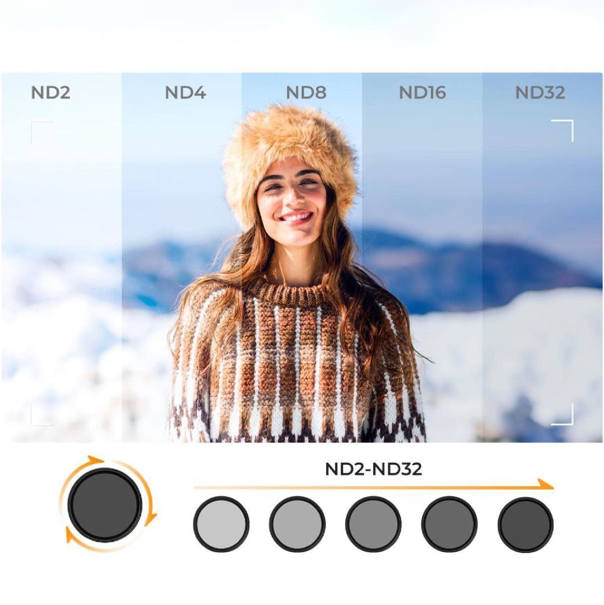 El filtro permite ajustar la opacidad de ND2 hasta ND32, equivalente a 5 niveles de reducción de luz. Se adapta a cualquier condición de iluminación, desde escenas muy iluminadas hasta entornos con poca luz. Esto te permite controlar la exposición, la profundidad de campo y lograr efectos de movimiento suaves, como en una cámara profesional.