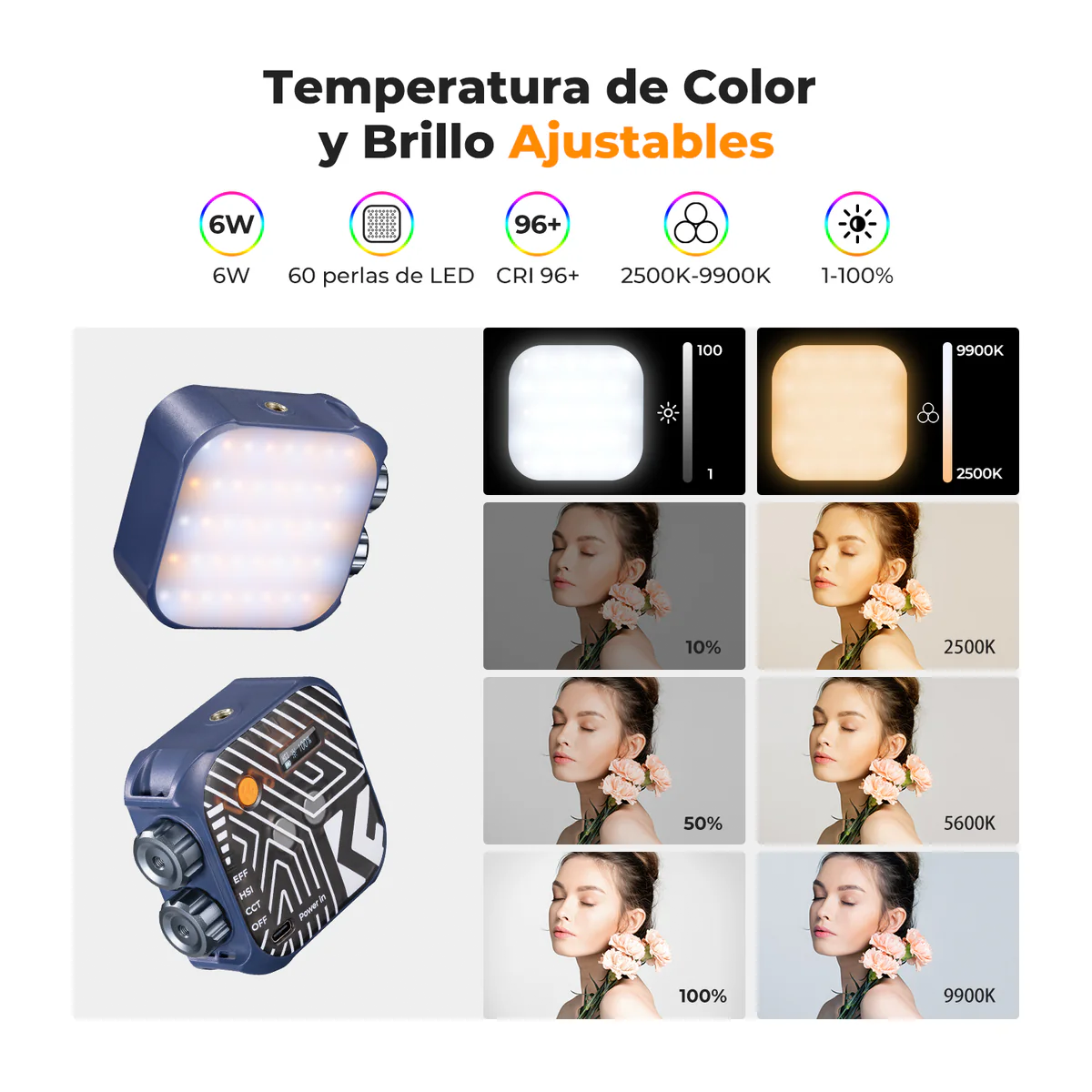 Su sistema bicolor (más RGB), puedes ajustar la temperatura de color o elegir tonos creativos con efectos de luz dinámicos, ideal para fotografía, video, vlogs, streaming y contenido en redes sociales.
