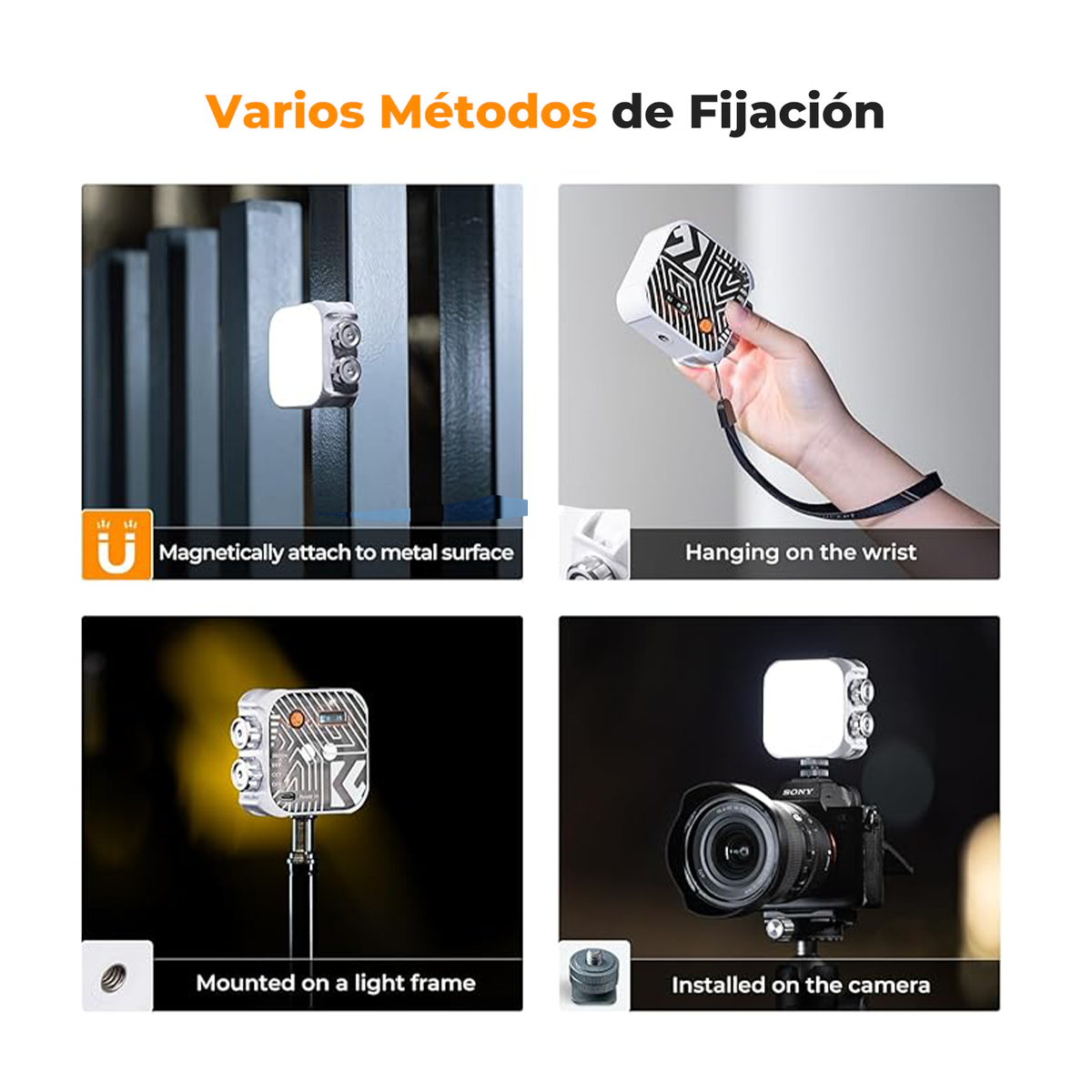 Montaje / compatibilidad: incluye rosca estándar (1/4″) para trípode o cámara; puede colocarse en rigs, trípodes o equipamiento fotográfico.