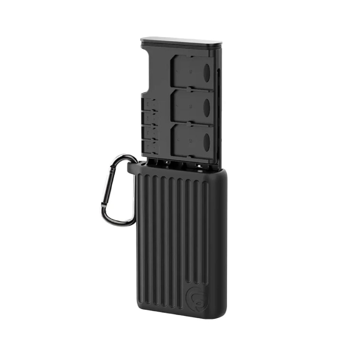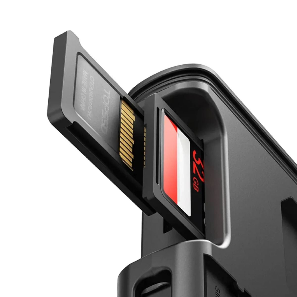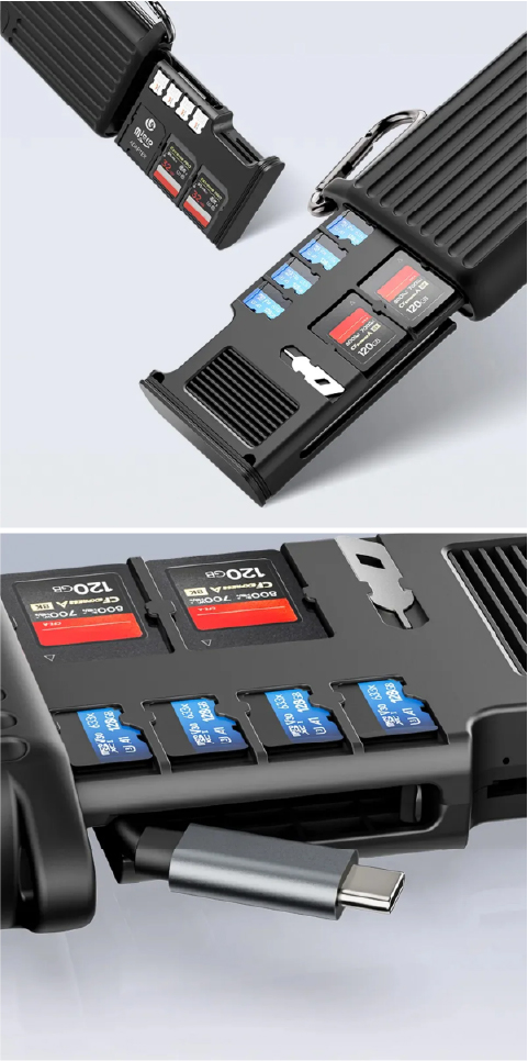 No es solo un lector, también funciona como un estuche de almacenamiento inteligente. Cuenta con múltiples compartimentos para organizar tarjetas CFexpress, SD, Micro SD y Nano SIM, manteniendo todo en su lugar, seguro y fácilmente accesible.