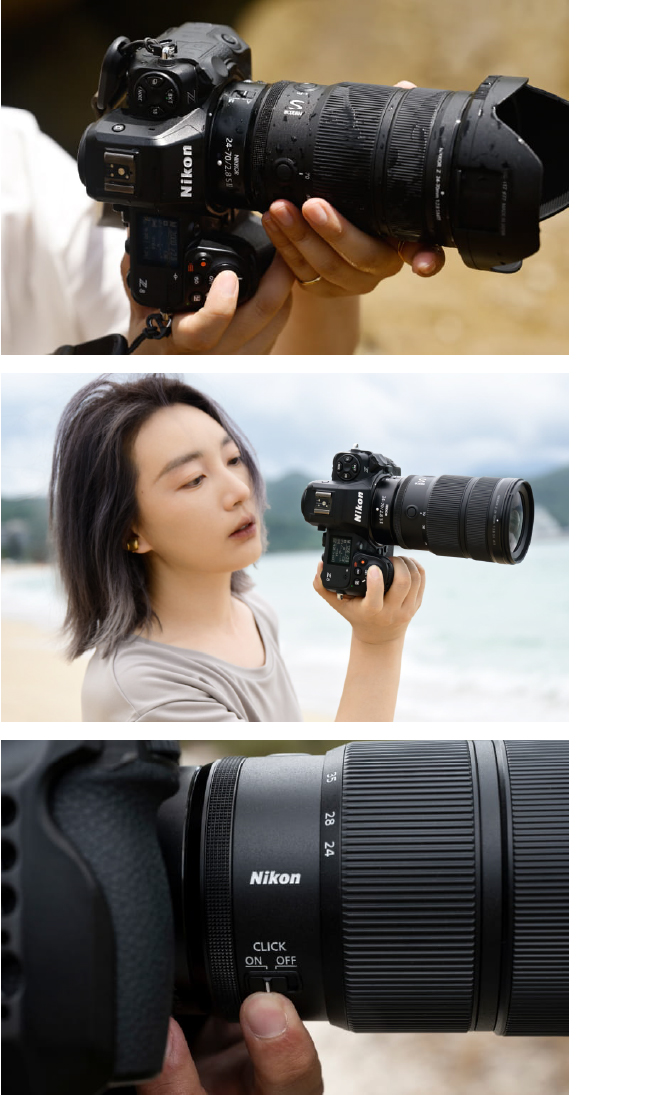 El diseño de zoom interno mantiene el lente con la misma longitud sin importar si trabajas en 24mm, 50mm o 70mm. Esto no solo aporta comodidad al sujetar la cámara, también garantiza un equilibrio constante en trípodes y gimbals, reduciendo vibraciones y movimientos indeseados durante la grabación de video. Además, al no extenderse, disminuye el ingreso de polvo y humedad, aportando mayor durabilidad.
