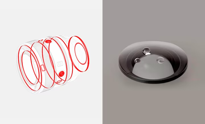 El elemento frontal del lente tiene un revestimiento de flúor que repele huellas digitales, polvo, agua, aceite y otros, a la vez que facilita limpiar la suciedad que se fije a la superficie. Su diseño resistente al polvo y a la humedad ofrece más fiabilidad para su uso en áreas exteriores y condiciones adversas.