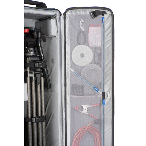 Dentro de Video Tripod Manager 44, paneles laterales reforzados y resistentes al aplastamiento, los cojines ajustables en todo el compartimiento principal permiten que el soporte se concentre donde más se necesita, como alrededor de las partes móviles de la cabeza de un trípode. Un cierre con cremallera resistente a la abrasión se extiende alrededor de la parte superior e inferior de esta caja rodante, así como hacia abajo por un lado. Después de que el panel trasero del Video Tripod Manager 44 se coloca contra el suelo de modo que su panel frontal quede hacia arriba, se puede acceder al compartimiento principal abriendo el cierre con cremallera. Los rieles deslizantes elevan el panel trasero, protegiéndolo de abrasiones y humedad. Después de soltar el cierre con cremallera, el panel frontal se puede abrir para revelar dos bolsillos de malla con cremallera que se pueden usar para almacenar y organizar cintas adhesivas, cables o herramientas.