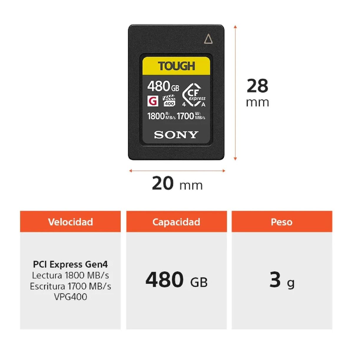 La tarjeta de memoria Sony CFexpress Tipo A CEA-G480T de 480 GB está diseñada para satisfacer las demandas de fotógrafos y videógrafos profesionales que trabajan con flujos de datos intensivos. Su alto rendimiento, gran capacidad y fiabilidad la convierten en una herramienta esencial para capturar imágenes de alta resolución y video profesional sin comprometer velocidad ni estabilidad, incluso en los entornos de trabajo más exigentes.
