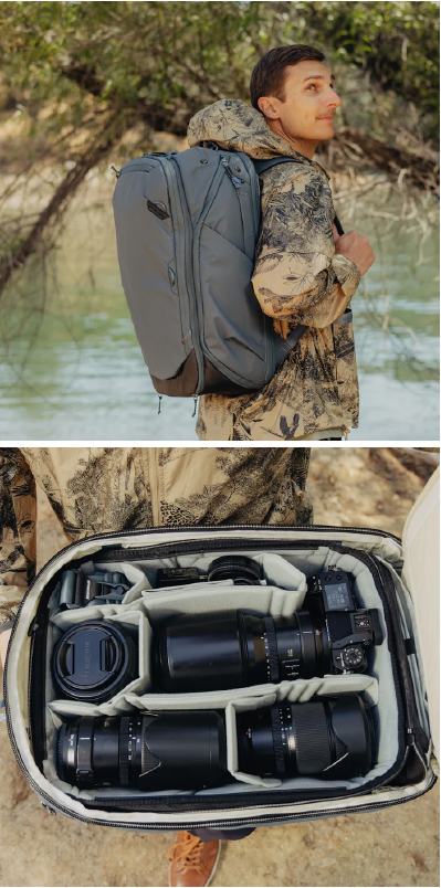 Cuenta con múltiples puntos de acceso, incluyendo apertura trasera completa tipo maleta y accesos laterales rápidos. Esto facilita localizar tu equipo sin desordenar el resto del contenido. Es compatible con los Camera Cubes de Peak Design, lo que permite convertirla fácilmente en una mochila fotográfica profesional.