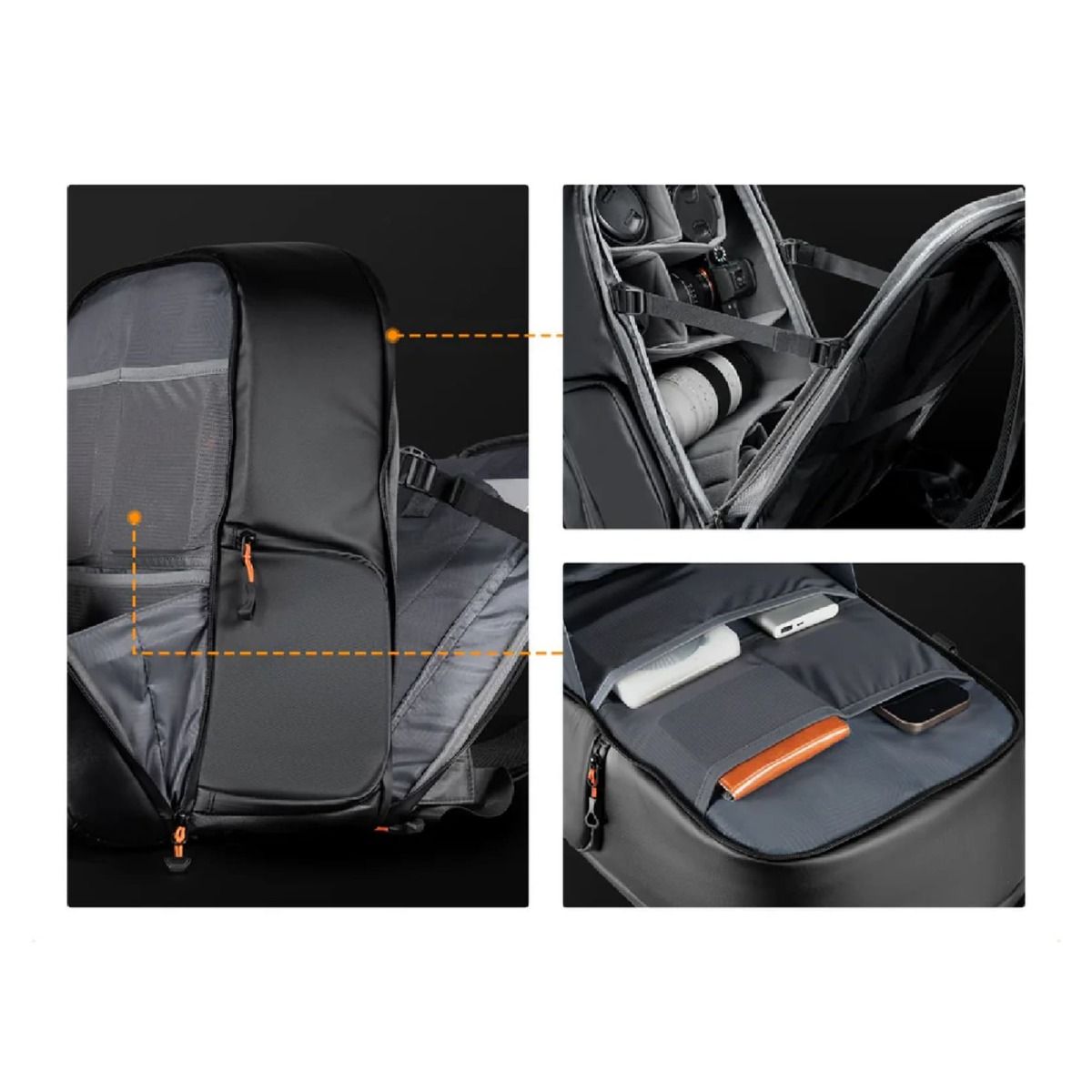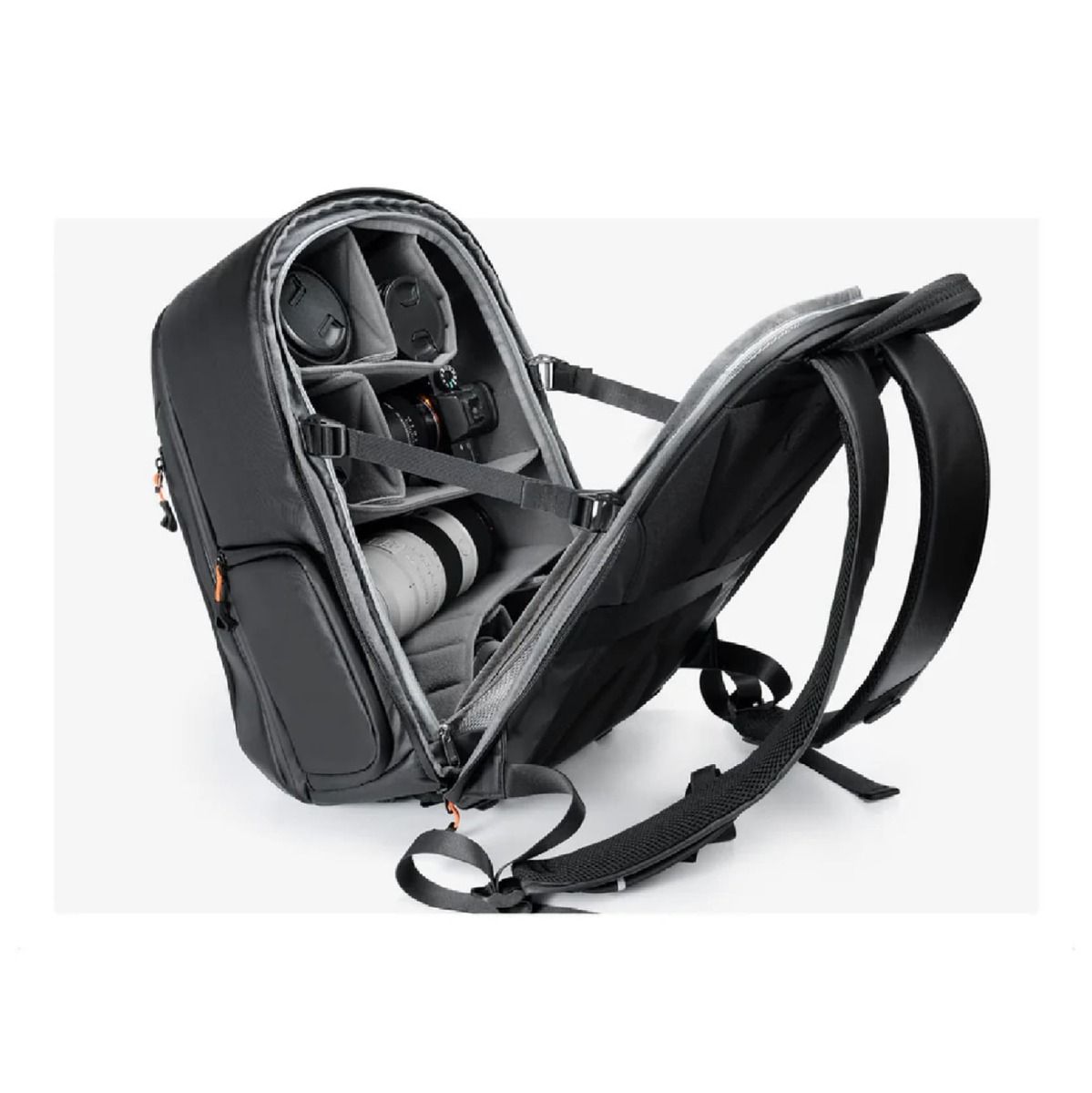 Un divisor interno permite separar la parte superior e inferior de la mochila, ofreciendo un espacio versátil para combinar equipo fotográfico con ropa o accesorios de viaje. Su diseño sobrio la hace perfecta para fotografía, dron, video o incluso uso urbano cotidiano.