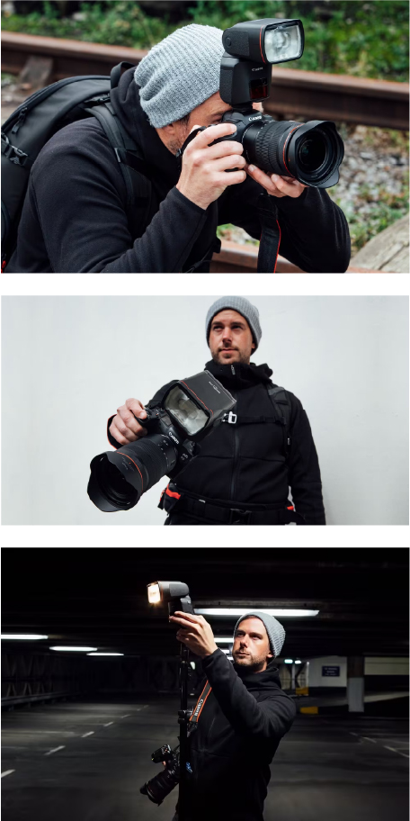 La luz LED bicolor de modelado permite previsualizar la iluminación y las sombras, mientras que el modo manual ajustable entre máxima potencia y 1/8192 garantiza un control total sobre cada disparo.