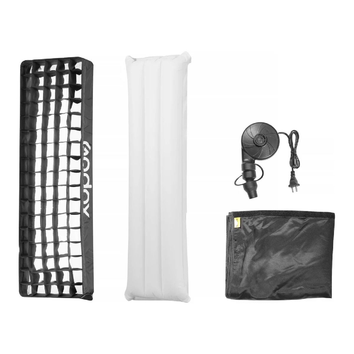 El paquete incluye todo lo necesario para empezar a usarlo: el softbox inflable, una rejilla para control de luz, una bomba electrónica para inflado rápido y una bolsa de transporte que facilita su almacenamiento y traslado entre locaciones.