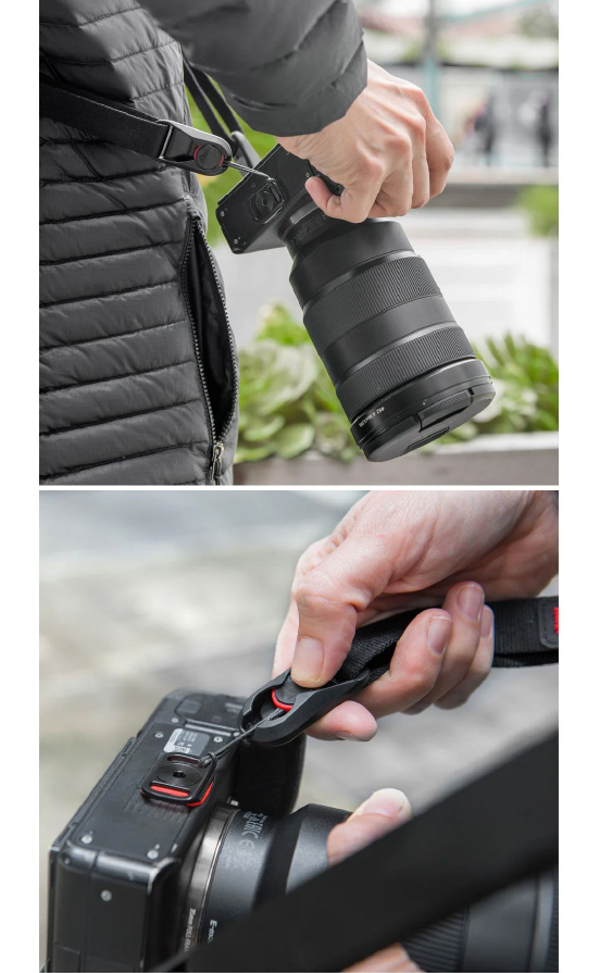 La PL-AN-1 está diseñada para mantener tu cámara firmemente sujeta a la correa, incluso en situaciones de movimiento intenso o al realizar tomas rápidas. Su mecanismo de bloqueo evita aperturas accidentales, garantizando que tu equipo permanezca seguro sin necesidad de revisiones constantes. Esto proporciona tranquilidad, permitiéndote concentrarte en capturar la mejor foto en todo momento.