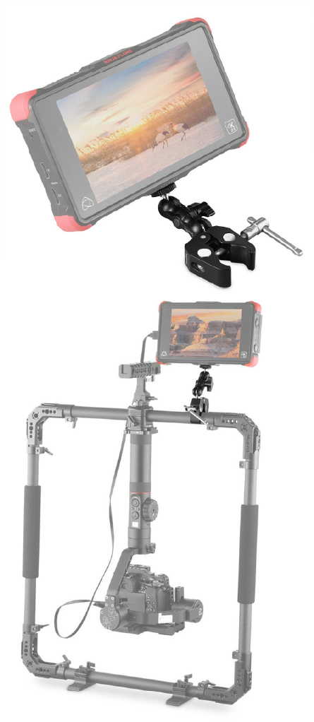 Cuenta con tornillos de montaje estándar que permiten instalar una amplia variedad de dispositivos. Es compatible con monitores externos, luces LED, micrófonos, cámaras de acción y otros accesorios con roscas universales. Esto facilita su integración en distintos sistemas y configuraciones de producción.