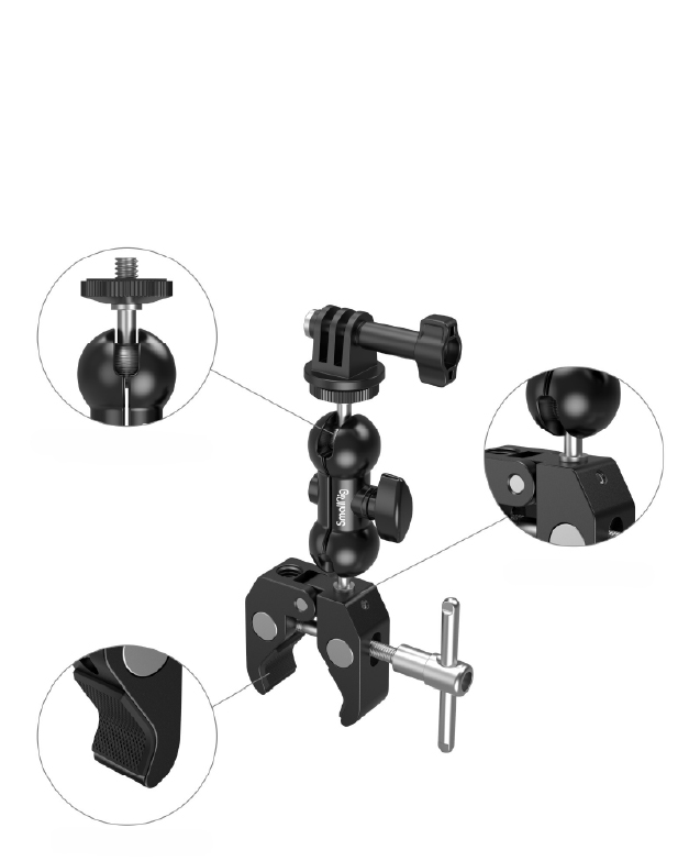 La abrazadera está diseñada para sujetarse firmemente a superficies como tubos, mesas, barras, trípodes o rigs. Su estructura robusta proporciona un agarre sólido y estable, reduciendo vibraciones y movimientos no deseados. Es ideal para configuraciones móviles o espacios reducidos donde un soporte tradicional no es viable.