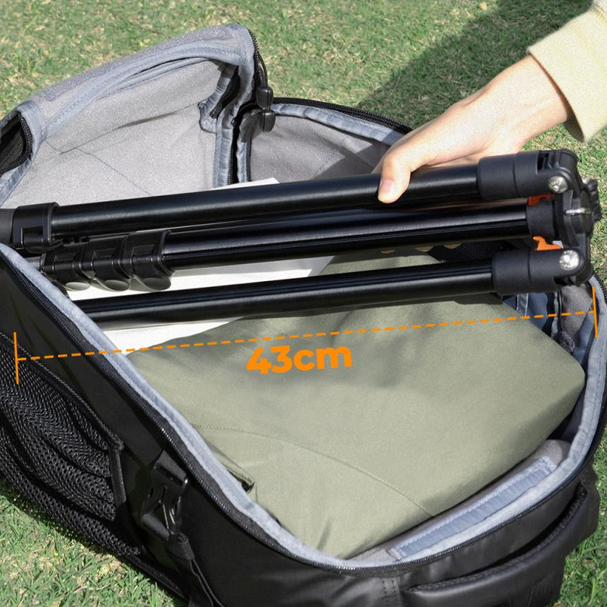 Al plegarse, el trípode alcanza unas dimensiones muy compactas — tan pequeñas que caben fácilmente en una mochila o maleta de 20". Esto lo convierte en un aliado perfecto para sesiones en exteriores, viajes o proyectos móviles, sin sacrificar estabilidad ni resistencia.