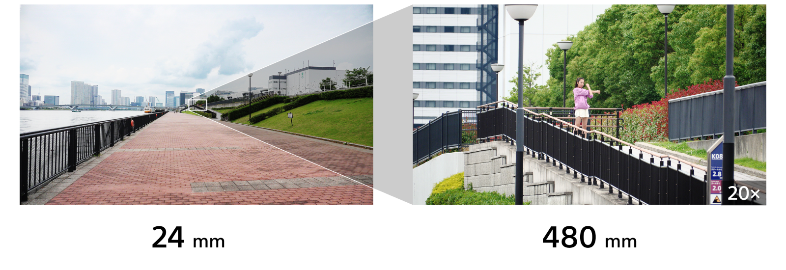 Con un rango de zoom óptico de 24 a 480 mm (equivalente a full-frame de 35 mm), tiene el respaldo de la tecnología Clear Image Zoom de Sony, que agrega la capacidad para alcanzar 30x de zoom al grabar en 4K o 40x de zoom en FHD. Y puede explorar las aperturas máximas de F2.8 (gran angular) y F4.5 (teleobjetivo) haciendo zoom de manera rápida, fluida y silenciosa.